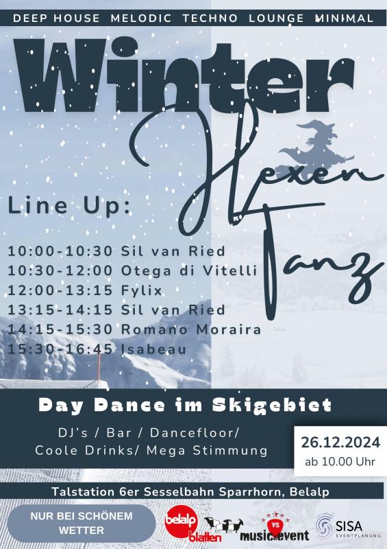 wir freuen uns, Sie am 26. Dezember 2024 zu einem besonderen Event einladen zu dürfen: dem Day Dance an der Talstation des 6-er Sessellifts Sparrhorn. Ab 10:00 Uhr erwartet Sie ein Tag voller Musik, Tanz und guter Laune inmitten der wunderschönen Winterlandschaft der Belalp.