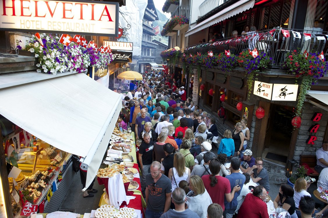 Der Nationalfeiertag in Zermatt wäre nicht derselbe, ohne sein traditionelles Strassenfest am Vorabend. Rot-weisse Fahnen, Schweizer-Musik, Street-Food und gemütliches Beisammensein, so feiert Zermatt den Geburtstag der Schweiz!