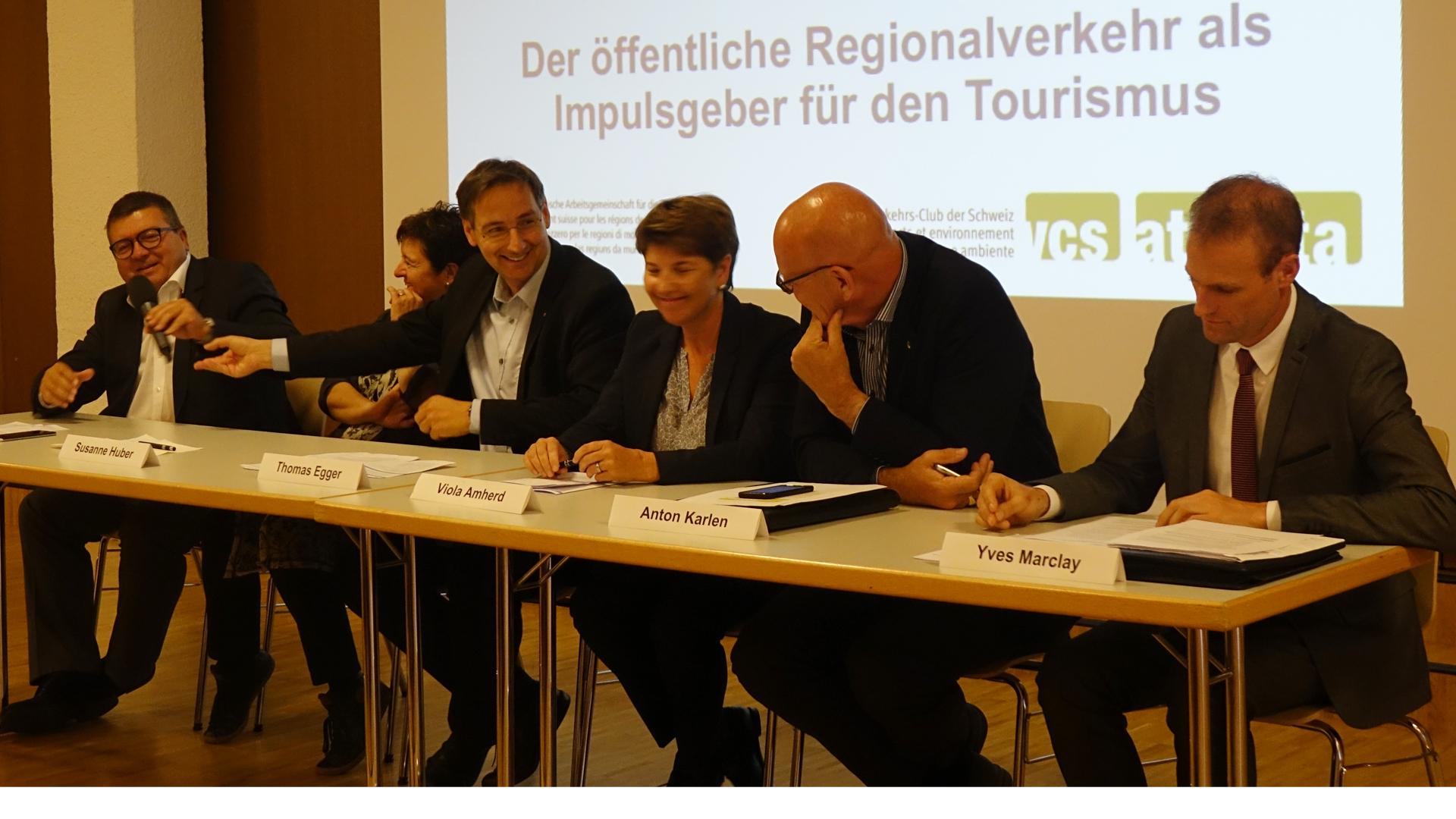Brig-Glis: Regionalverkehr als Innovationstreiber für den Tourismus18.05.2017, 18:31 Wie wichtig ist der öffentliche Verkehr für den Tourismus? Welche Synergien gibt es zwischen den beiden? Diese und ähnliche Fragen beantwortete eine öffentliche Tagung am Donnerstagnachmittag im Briger Pfarreizentrum. Organisiert haben sie die Schweizerische Arbeitsgemeinschaft für die Berggebiete und der Verkehrsclub der Schweiz Sektion Wallis. Als Referenten traten Sandro Borrelli, Marketingleiter bei der BLS, Gerhard Fischer, Präsident der IG Grimselbahn, Joachim Dejaco von der Südtiroler Vinschgaubahn, Dieter Bogner, Projektleiter des Programms San Gottardo 2020 und Samuel Bernhard von Bus Alpin auf. Fischer zeigte in seinem Referat auf, dass er mit seinen Mitstreitern bereits eine Studie von der Universität St. Gallen ausarbeiten liess. Diese klärt auf, dass die Grimselbahn pro Jahr rund 400'000 Passagiere befördern könnte. Dies würde eine jährliche Wertschöpfung von rund sechs Millionen Franken und 35 neue Arbeitsstellen mit sich bringen. Momentan läuft für die Grimselbahn die Projektierungsphase. Fischer hofft, dass 2027 der Spatenstich erfolgen kann. Den Abschluss des Anlasses bildete eine Podiumsdiskussion unter der Leitung von Thomas Egger, Direktor der Schweizerischen Arbeitsgemeinschaft für die Berggebiete. Zusammen mit ihm diskutierten CVPO-Nationalrätin Viola Amherd, Marco Tacchella, Leiter Marketing bei der MGBahn, Anton Karlen von Postauto Wallis, Susanne Huber, Geschäftsführerin Volkswirtschaft Berner Oberland und Yves Marclay, Direktor von Regionalps. Dabei hob Anton Karlen hervor, dass die Regions- und Wirtschaftszentrum Oberwallis AG einen wichtigen Part in der Koordination von Tourismusprojekten einnehme und gute Arbeit leiste. Eine solche Koordinationsstelle fehlt beispielsweise in der Tourismusregion Berner Oberland. Viola Amherd betonte, dass es wichtig sei, auf nationaler Ebene weiter für Bahnprojekte wie den Grimseltunnel zu lobbyieren. Die Tagung im Briger Pfarreizentrum zeigte eindrücklich auf, dass der Regionalverkehr auf die öffentliche Hand angewiesen ist. 65 Prozent der Abgeltungen kommen vom Bund, 30 Prozent vom Kanton und der Rest von den Gemeinden. Die Podiumsdiskussion war angeregt. Dazu trugen auch kritische Voten aus dem Publikum bei./vm ![]() Bildquelle: zvg (Archivbild) ![]() Bildquelle: www.sdats.ch ![]() Bildquelle: mengis media ![]() Bildquelle: zvg ![]() Bildquelle: Leserreporter