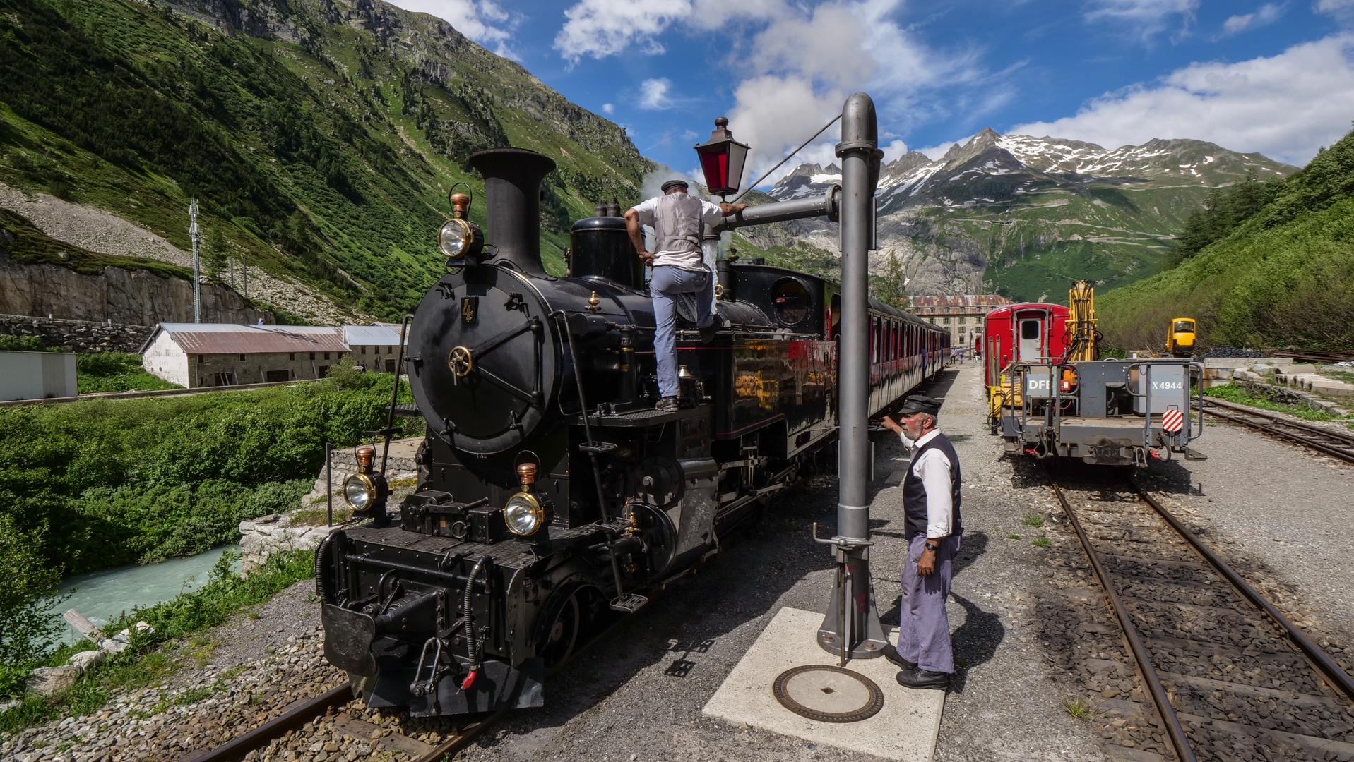Realp/Oberwald: Dampfbahn Furka Bergstrecke wieder in Betrieb05.07.2018, 06:22 Damit eine Dampfbahn funktioniert, braucht es nicht nur einen Lokführer, sondern auch einen Heizer. Zu dessen Aufgaben gehören allgemeine Kontrollarbeiten, Feuerrost putzen, anfeuern, schmieren sowie Kohle und Wasser laden. Georg Studer, Heizer der Dampfbahn Furka Bergstrecke, sagt, dass man als Heizer nicht nur Kohle und Wasser in den Ofen schiebe: "Heizer ist alles andere als ein leichter Job. Eine seiner wichtigsten Aufgaben, neben den ganzen Vorbereitungen vor der Abfahrt, ist es, während der Fahrt die Augen stets auf die Gleise zu richten, damit die Dampfbahn ohne Komplikationen ihr Ziel erreichen kann." Mit der Dampfbahn geht es von Realp nach Gletsch. In Tiefenbach hält die Dampfbahn, um Wasser zu fassen. Anschliessend geht es weiter in Richtung Furka, Muttbach-Belvedere bis schliesslich nach Gletsch. Die Wagen bleiben dann in Oberwald und die Lokomotive kehrt ohne Zugkomposition nach Gletsch zurück. Dort polieren die Zuständigen die Lokomotive und machen sie für die nächste Fahrt bereit./za