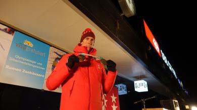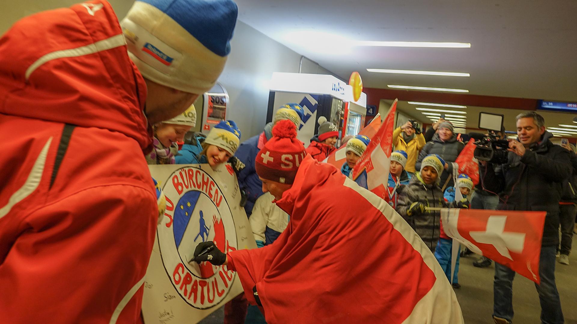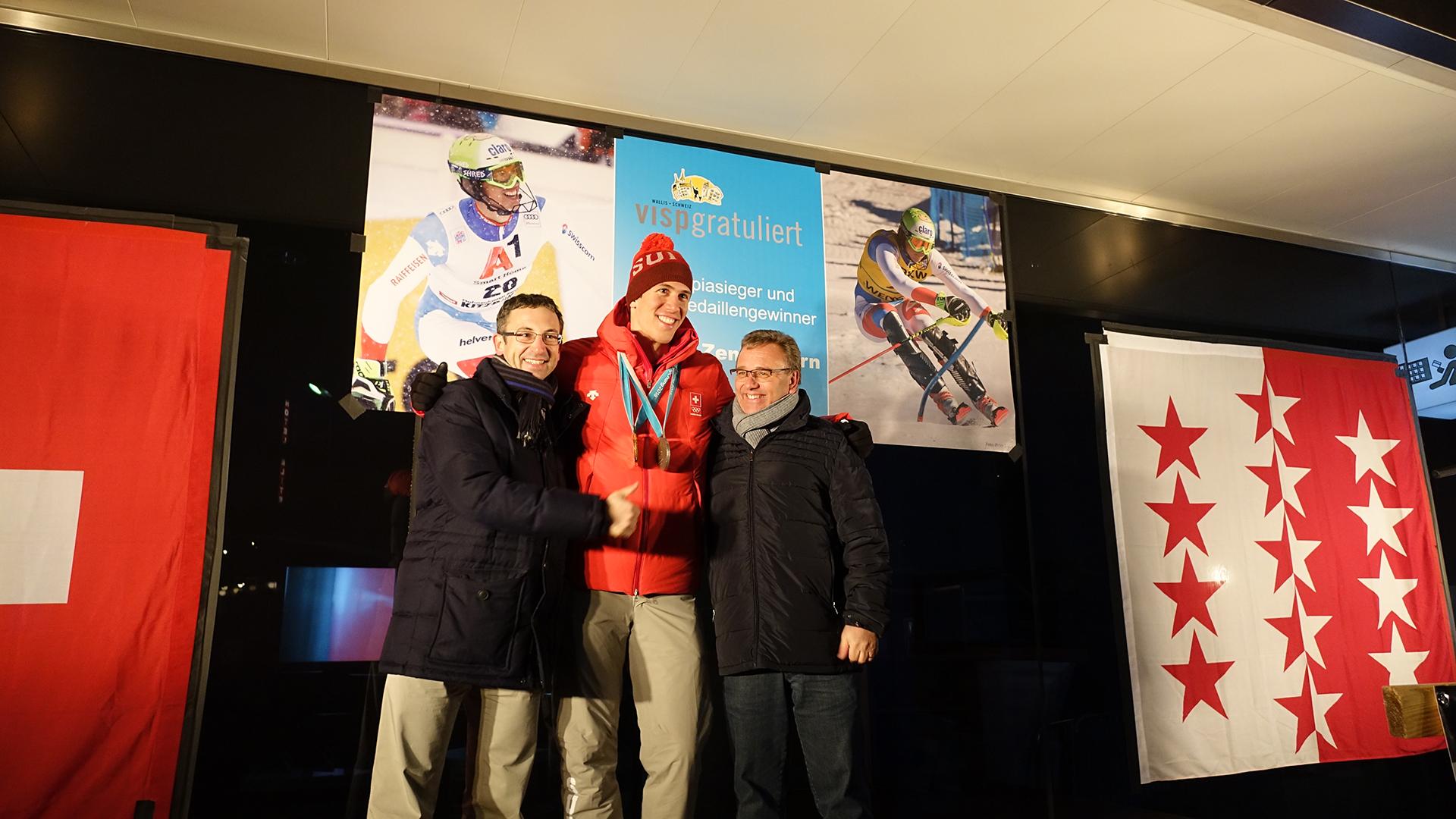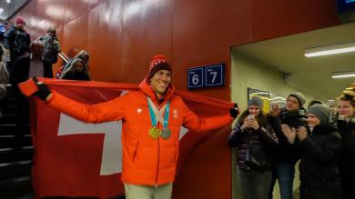 Visp: Frenetischer Empfang für den Olympiahelden26.02.2018, 22:32 Fans, Familie und Freunde folgten dem Aufruf der Gemeinden Visp und Bürchen für den spontanen Empfang von Ramon Zenhäusern am Montagabend beim Bahnhof Visp. Und dann kurz nach 21.30 Uhr kam der doppelte Olympiamedaillengewinner im Lonzastädtchen an. Ein emotionaler Anlass für alle Beteiligten. Auch für den sonst so coolen Ramon Zenhäusern. "Es ist genial, dass so viele Leute gekommen. Es freut mich besonders, dass Visper und Bürchner gemeinsam hier sind. Das bedeutet mir sehr viel." Doch wie erlebte der Oberwalliser Skirennfahrer die Heimreise? "Momentan bin ich todmüde. Seit 25 bis 30 Stunden bin ich auf der Heimreise. Jetzt freue ich mich auf mein Bett." Ausruhen kann er sich jedoch nicht lange. "Bis am Donnerstag will ich mich jetzt gut erholen. Dann geht es wieder weiter im Skizirkus, denn am Sonntag will ich auch im Slalom von Kranjska Gora etwas zeigen", blickt Zenhäusern voraus. Am Empfang nahm Ramon Zenhäusern die Gratulationen der Gemeindepräsidenten von Visp und Bürchen, Niklaus Furger und Philipp Zenhäusern, entgegen. Diese würdigten die Leistungen des Olympiasiegers. Weiter waren auch die Staatsräte Roberto Schmidt und Frédéric Favre anwesend. Als Vertreter von Swiss Ski nahm Vizepräsident Claude-Alain Schmidhalter an dem Anlass teil./gp